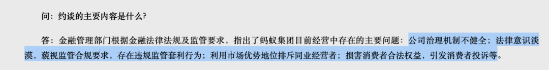 首先,来看措辞。在上一次约谈时(去年12月底),四大金融管理部门对蚂蚁的评价是这样的——“公司治理机制不健全;法律意识淡漠,藐视监管合规要求,存在违规监管套利行为;利用市场优势地位排斥同业经营者;损害消费者合法权益,引发消费者投诉等。”