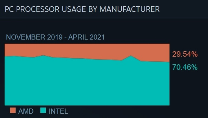 在Steam更新的4月份硬件调查中,采用AMD处理器的PC游戏玩家份额达到29.54%,这是过去12个月的新高。尽管Intel在几个月前曾以81%的份额令人刮目相看,但最新数据却减少到了70.46%。