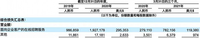 亏损的另一大原因是BOSS直聘的营收来源相对单一,主要营收来自于面向企业客户的在线招聘服务,分为自助式的小额短期服务和直销团队跟踪式的大额长期服务两类,2019年和2020年全年,其他收入占比仅有1.2%和0.8%。而前程无忧、猎聘这两家相对传统的招聘平台,会通过提供猎头、IPU(批量招聘中低端岗位)、校招、培训等外包服务进行创收。