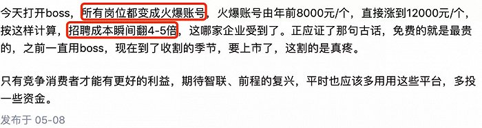 在知乎上一个“BOSS直聘又涨价”的提问下,有用户也提到了火爆账号的涨价问题,称招聘成本瞬间翻了4-5倍。