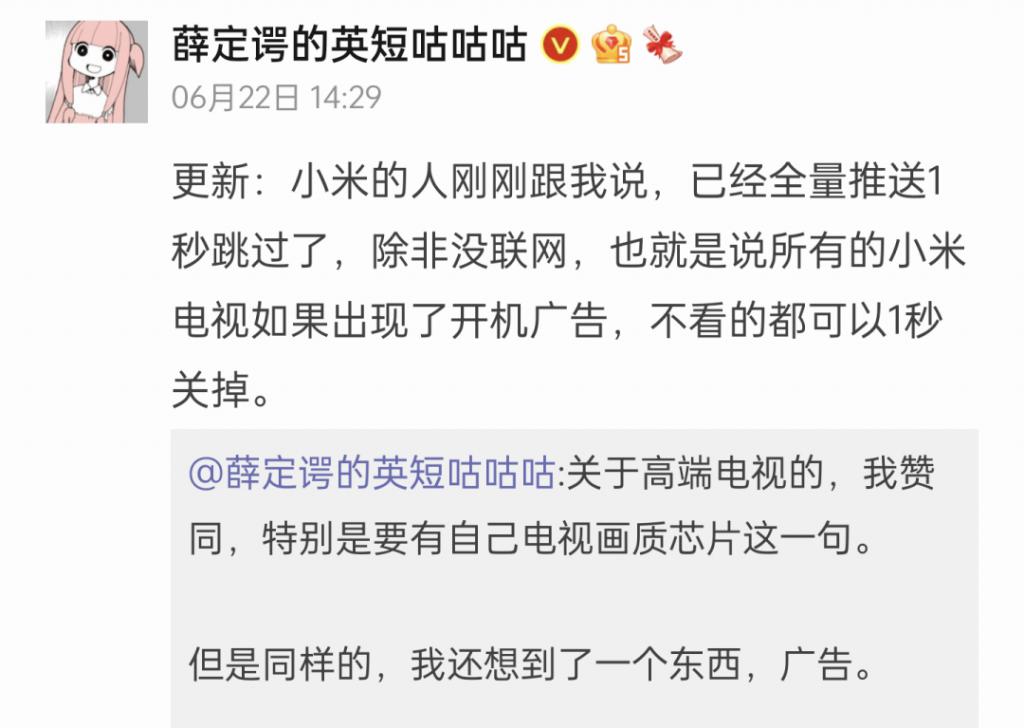 但最近有博主爆料,小米电视的开机广告已经不再像过去那样烦人,全都支持 1 秒跳过。
