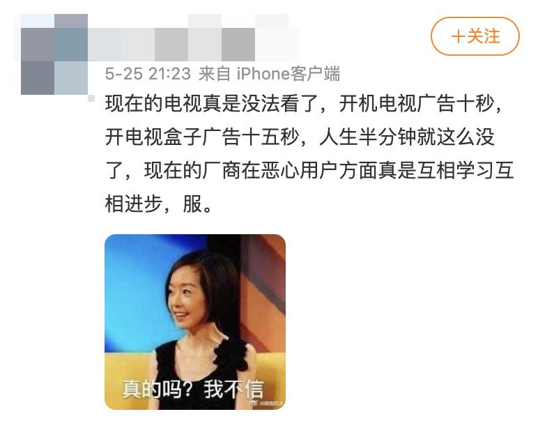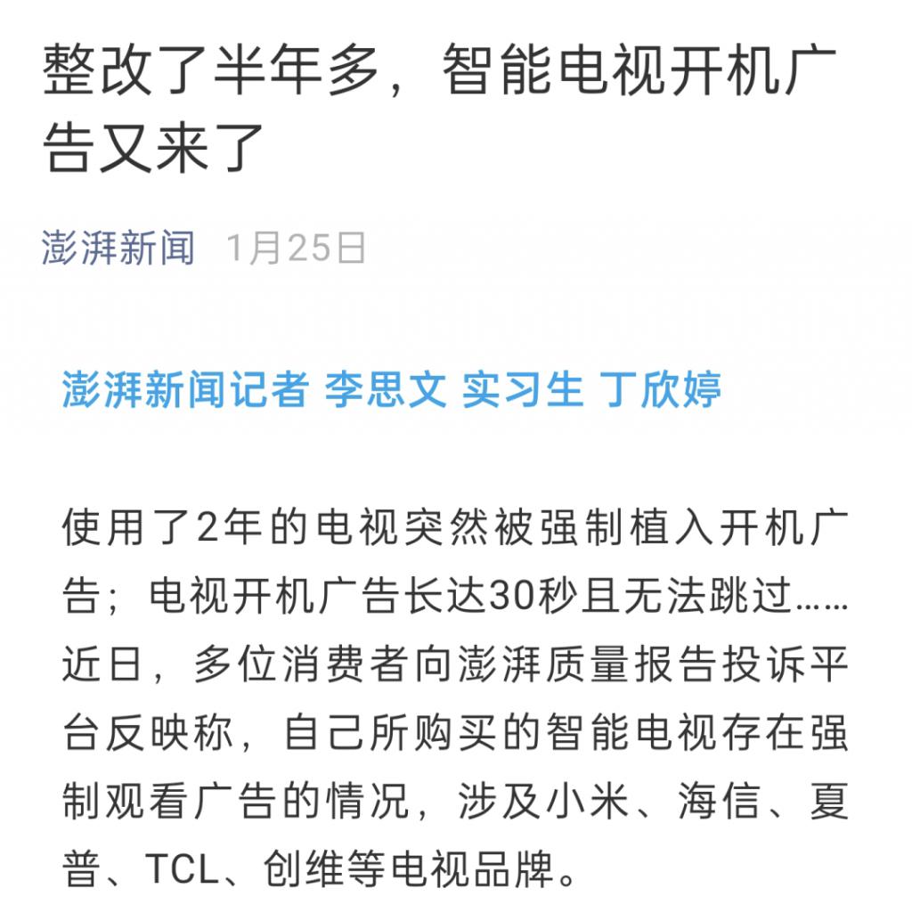 因为电视开机广告,一来没有一键关闭按钮,必须看完;二来厂商没有提供去广告服务,哪怕付费都不行。