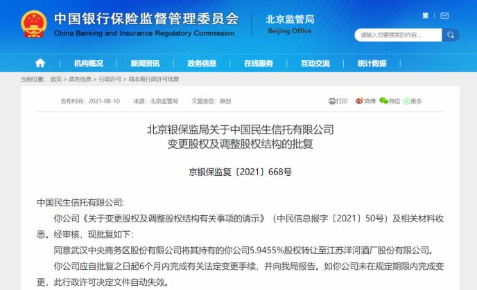 近日,北京银保监局发布《关于中国民生信托有限公司变更股权及调整股权结构的批复》,同意武汉中央商务区股份有限公司将其持有的民生信托5.9455%股权转让至江苏洋河酒厂股份有限公司。