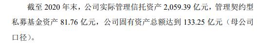 截至2020年末,民生信托实际管理信托资产2059.39亿元,管理契约型私募基金资产 81.76 亿元,固有资产总额达到133.25亿元(母公司口径)。