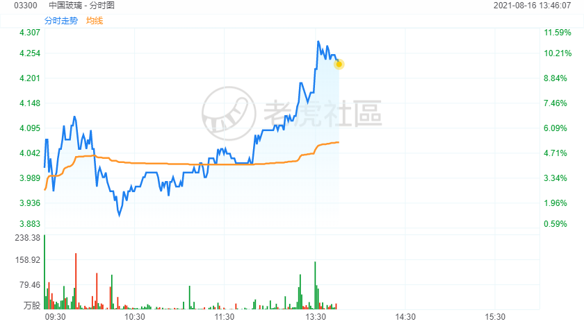 8月16日讯,中国玻璃继续走强,大幅拉升涨超10%,年内股价已暴涨7倍。现报4.28港元创逾10年新高价,暂成交1.3亿港元,总市值近80亿港元。中国玻璃日前获股东施丹红在场内以每股均价3.3226港元增持439.2万股,涉资约1459.3万港元。公司拟8月27日举行董事会会议审核中期业绩,此前公司预告扭亏,半年至少赚3亿人民币。