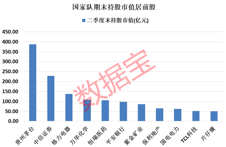 按照二季度末国家队合计持仓市值来看,持仓市值最高的前五名是贵州茅台、中信证券、格力电器、万华化学和恒瑞医药,持股市值均超过百亿元。贵州茅台获国家队合计持仓387.21亿元排在首位。