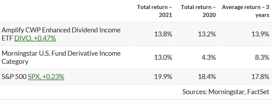 DIVO was established on Dec. 14, 2016. Here's a comparison of returns on an NAV basis (with dividends reinvested, even though the fund might be best for investors who need income) for the fund and its Morningstar category, along with returns for the S&P 500 calculated by FactSet: