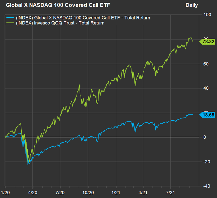 QYLD took a sharp dive during February 2020, as did QQQ. But you can see that QQQ recovered more quickly and then soared. QYLD continued paying its high distributions all through the pandemic crisis, but it couldn't capture most of QQQ's additional upside. It isn't designed to do it.