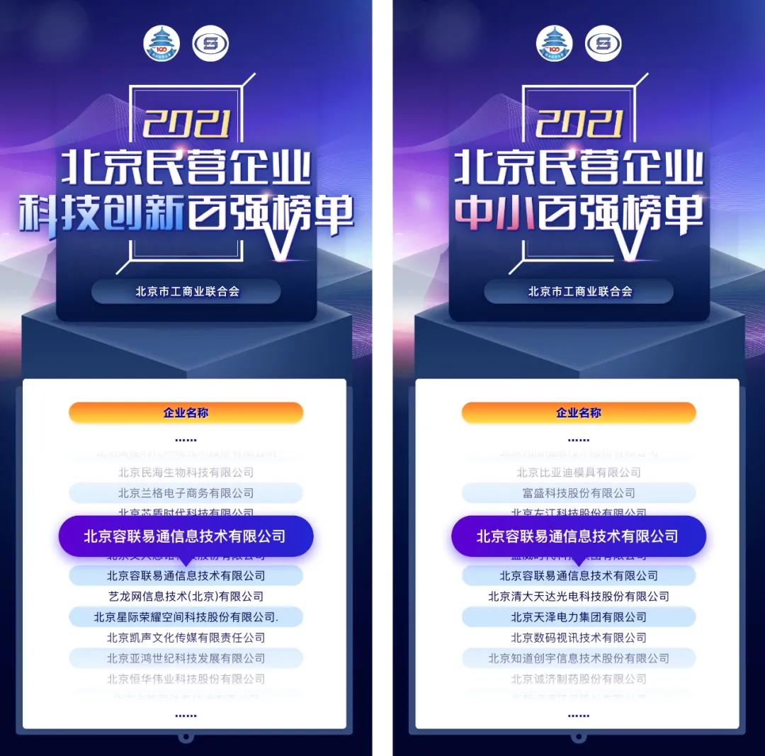 9月16日,北京市委统战部、北京市工商联发布“北京民企百强”系列榜单,容联云凭借科研创新能力、稳健的经营模式,企业整体实力入选双料榜单,同时被评选为“2021北京民营企业科技创新百强企业”、“2021北京民营企业中小百强企业”。