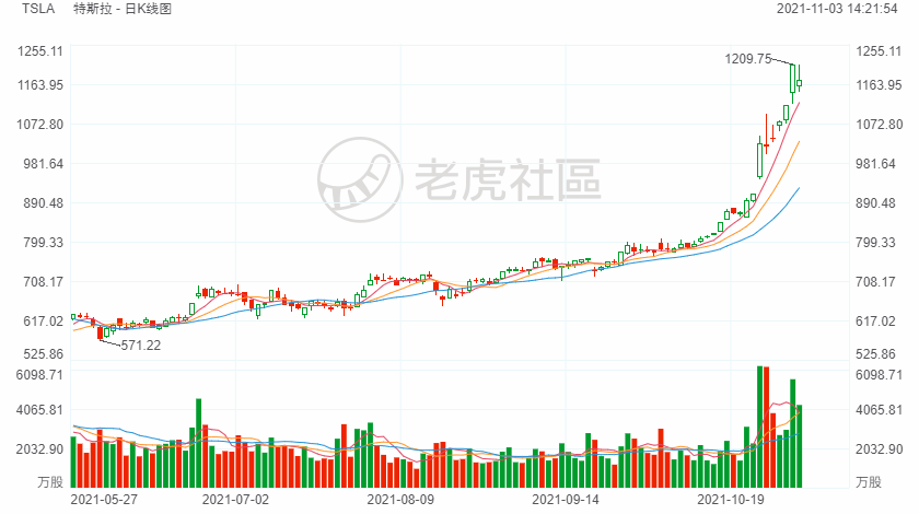 特斯拉股价周二下跌3.03%,收于1171.97美元,但过去一个月累计上涨约50%。