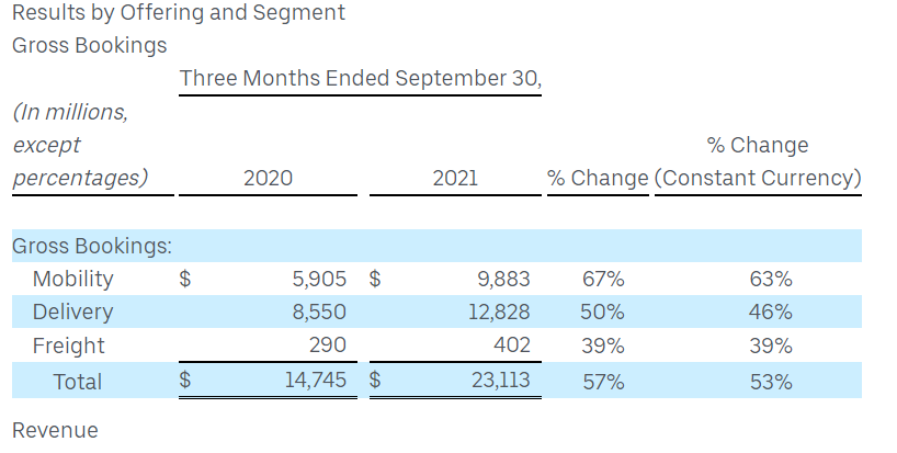 第三季度的总预订量(包括在其平台上乘车和外卖食品总价值)达到了 231.1 亿美元的历史新高,比去年同期增长了 57%,其中,外卖及配送收入再度超过移动出行业务,延续疫情以来的大趋势。同时,值得注意的是,两者收入差正在逐步缩小。货运收入为 4.02 亿美元,该公司在给股东的最新消息中表示,其送货商户数量已增至 780,000 多家。