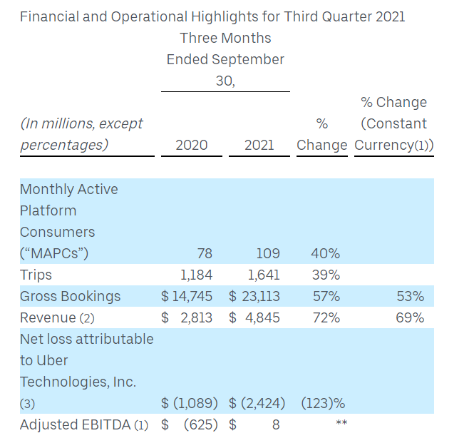 美东时间 11 月 4 日周四美股盘后,美国网约车市场的领导者、美国食品配送市场的第二大公司优步 Uber (NYSE:UBER)公布了截止 9 月30 日的 2021 财年第三季度财报,第三季度财报因为其乘车次数的恢复和交付量的增长, Uber 达到其收入里程碑,同时,迎来有史以来第一次在调整后利润正值,财报显示: