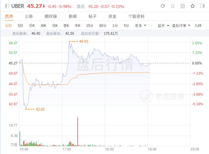 财报公布后,Uber 盘后股价经历下跌近 6% 后,自盘后低点反弹又反弹 8.5% 突破日内均价。年初至今,Uber 累计下跌 11.48%。