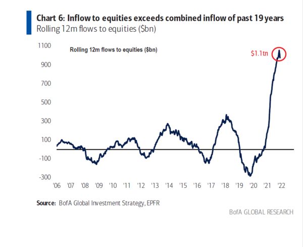 智通财经APP获悉,美国银行和EPFR Global的分析师表示,2021年,投资者向股票交易所交易基金(ETF)和多头基金投入了近9000亿美元,超过了过去19年的总和。