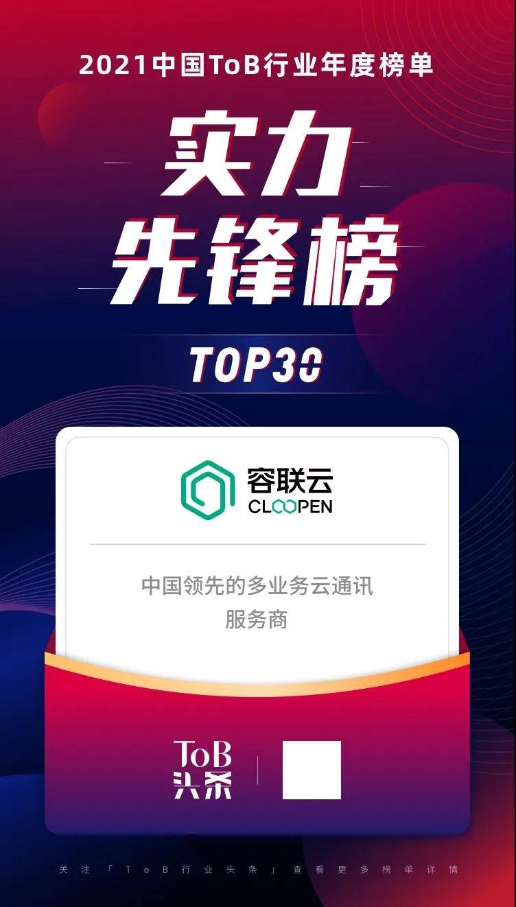 12月27日,「ToB行业头条」联手3W集团、50+投资机构及行业专家,正式发布了《2021ToB行业年度榜单·实力先锋榜》,评选出了2021年ToB领域各赛道最具实力的先锋企业TOP 30。作为助力企业营销与服务数智化转型的SaaS服务商,容联云上榜。