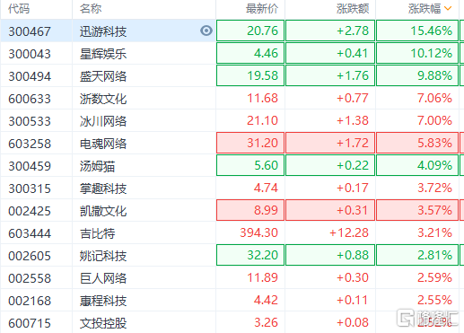 今日,受此消息共振,A股游戏概念大幅飙升,迅游科技涨超15%,星辉娱乐涨超10%,盛天网络、掌趣科技等跟涨。