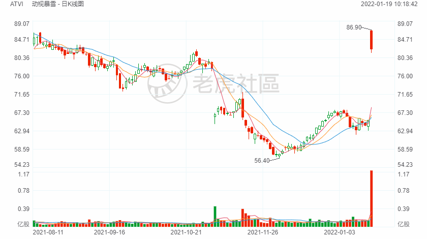 受收购消息影响,动视暴雪昨日暴涨近26%报82.31美元,总市值641亿美元。