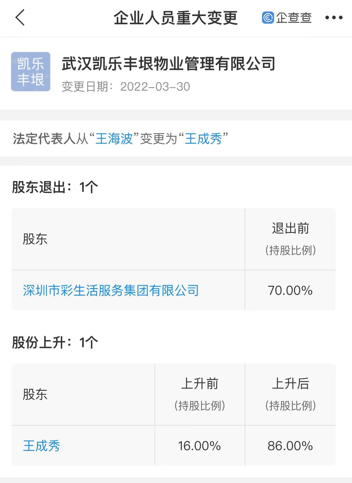 乐居财经讯 吴文婷3月30日,深圳市彩生活服务集团有限公司(以下简称“彩生活”)转让武汉凯乐丰垠物业管理有限公司(以下简称“凯乐丰垠物业”)70%股权,王成秀接盘。