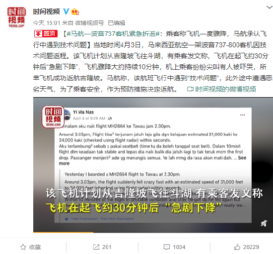 【#马航一波音737客机紧急折返#:乘客称飞机一度骤降,马航承认飞行中遇到技术问题】当地时间4月3日,马来西亚航空一架波音737-800客机因技术问题返程。该飞机计划从吉隆坡飞往斗湖,有乘客发文称,飞机在起飞约30分钟后“急剧下降”,飞机骤降大约持续10分钟,机上乘客纷纷尖叫有人被吓哭,所幸飞机成功返航吉隆坡。马航称,该航班飞行中遇到“技术问题”,此外途中遭遇恶劣天气,为了乘客安全,作为预防措施决定返航。