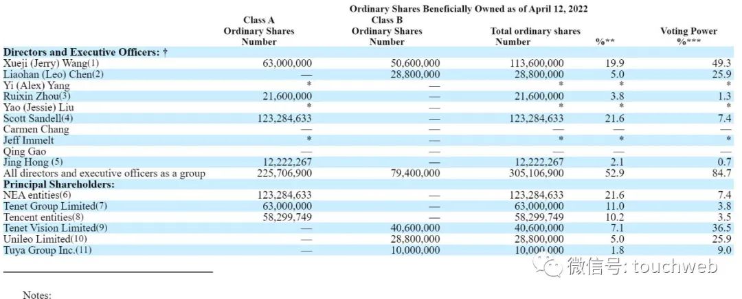 Jing Hong持股为2.1%,有0.7%的投票权;Scott Sandell持股为21.6%,有7.4%的投票权;腾讯持股为10.2%,有3.5%的投票权。