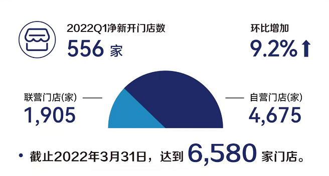 在门店数量方面,净新开门店数第一季度为556家,总门店数量较2021年第四季度末环比增长9.2%。截止至一季度末达到6580家门店,其中4675家为自营门店,1905家为联营门店。远超于星巴克中国4月3日公布的二季度数据5654家。
