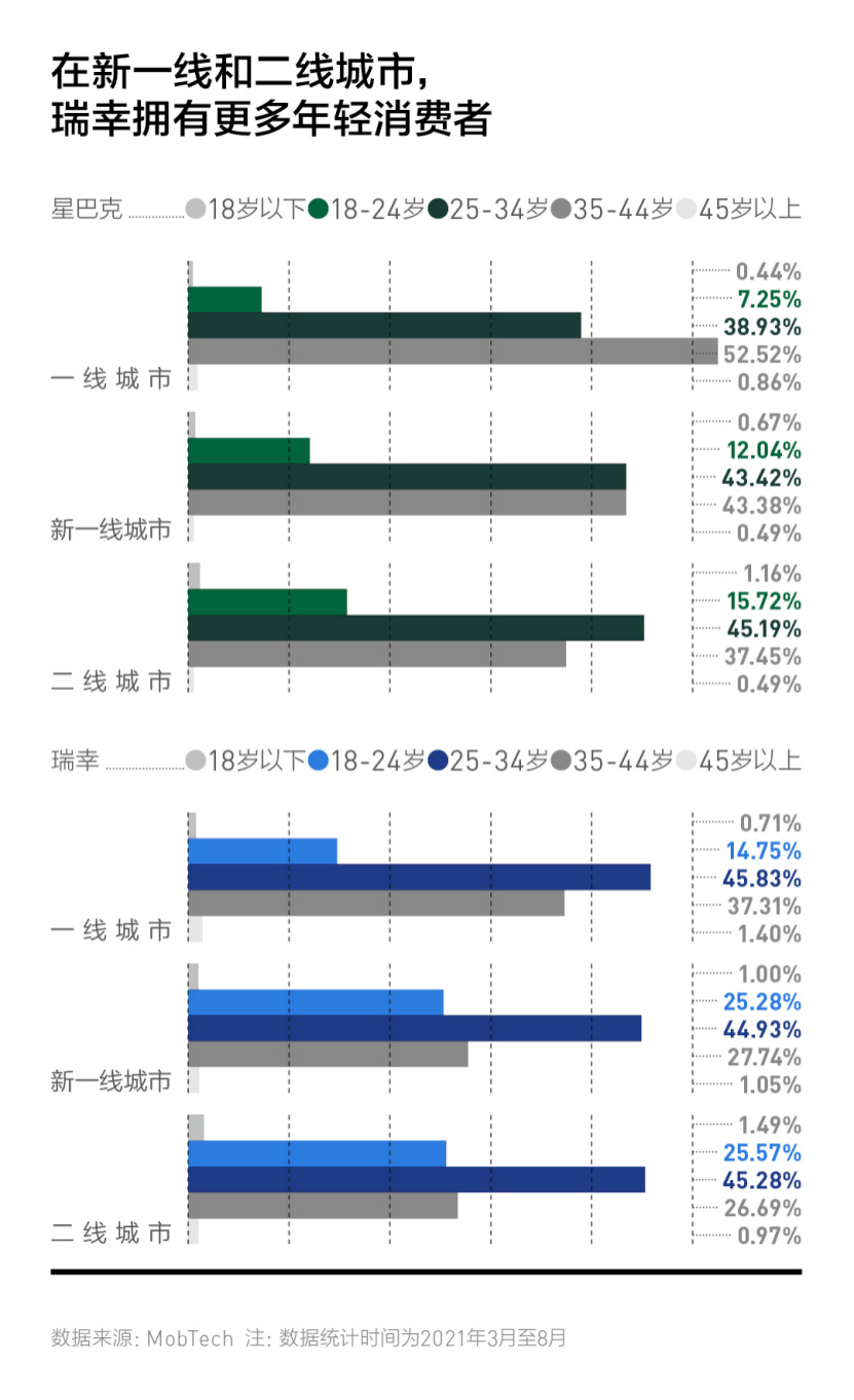 同时,在新一线城市和二线城市18-24岁咖啡消费者的占比中,瑞幸都达到了25%以上,星巴克的占比则分别为12.04%和15.72%。