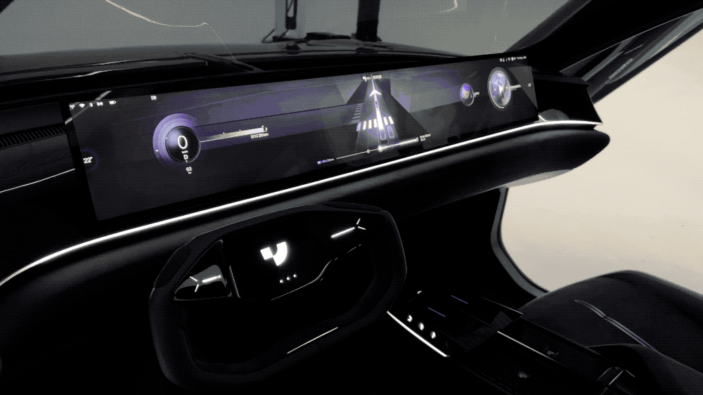 ROBO-01的中控屏幕可以算是整个车内的一大亮点,采用了一整块从主驾位贯穿至副驾位的超宽“带鱼屏”,中间没有任何隔断,从左到右分别显示车辆仪表、导航信息以及副驾娱乐内容。