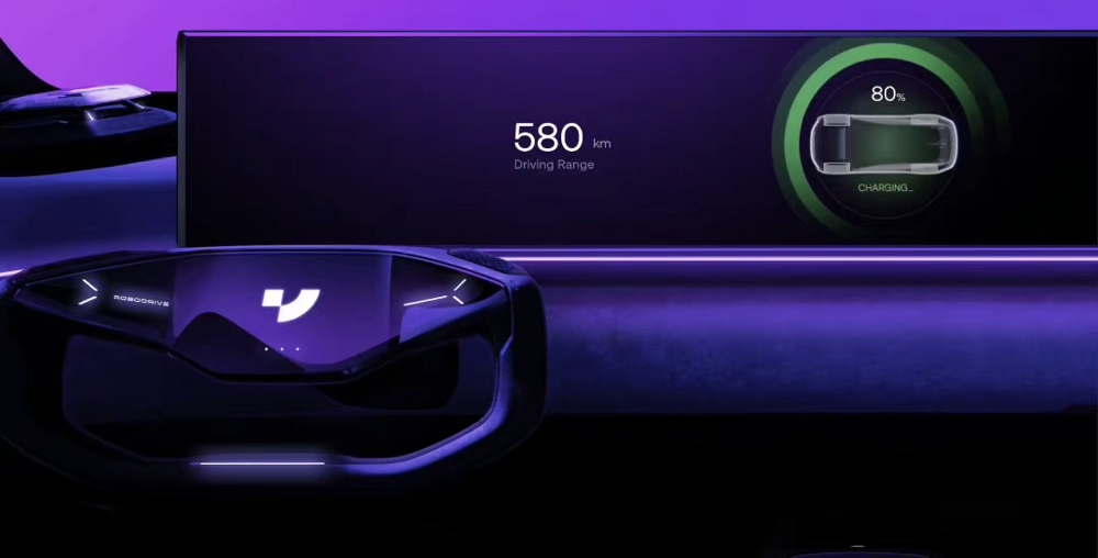 此外,ROBO-01的方向盘与特斯拉新款Model S/X的Yoke方向盘十分类似,但前者方向盘可以进行折叠,最大限度地提升“带鱼屏”的可视性。并且,得益于线控底盘技术,方向盘可以实现可变转向比,进一步提升驾控体验。