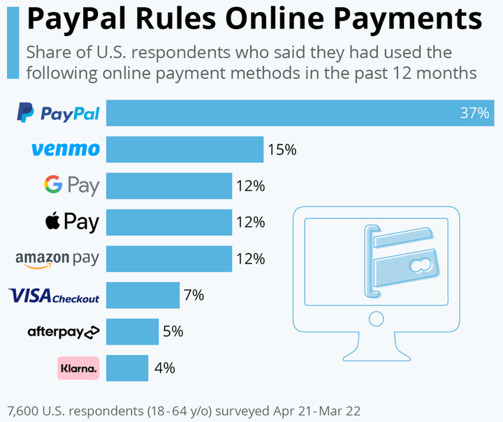 互联网巨头PayPal继续统治美国的在线支付服务。据媒体全球消费者调查,37%的美国受访者表示在过去12个月中至少使用过一次该服务,受欢迎程度是2012年PayPal收购的点对点支付平台Venmo的两倍多。亚马逊、苹果和谷歌的支付服务则各有12%的使用率。