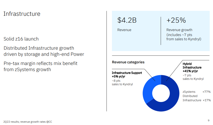 - 包括基础设施和云服务以及技术支持服务在内的全球基础设施业务收入录得42.4亿美元,高于分析师预期37.9亿美元,同比增长19%(按固定汇率增长25%)。其中,混合基础设施增长34%(按固定汇率增长41%,其中30%来自于混合云的收入增长。)