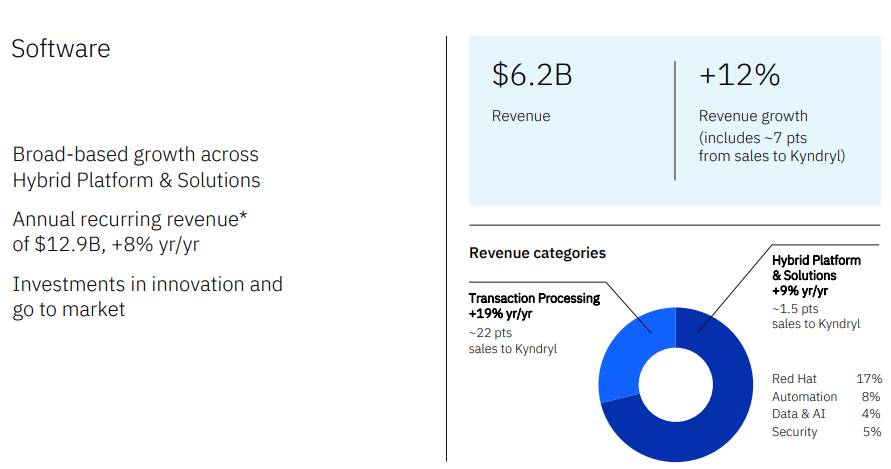 - 包括云应用及交易处理平台的云和认知软件业务的软件业务收入为62亿美元,低于预期63亿美元,同比增长6%(按固定汇率增长12%,其中约7%来自于Kyndryl的销售收入);