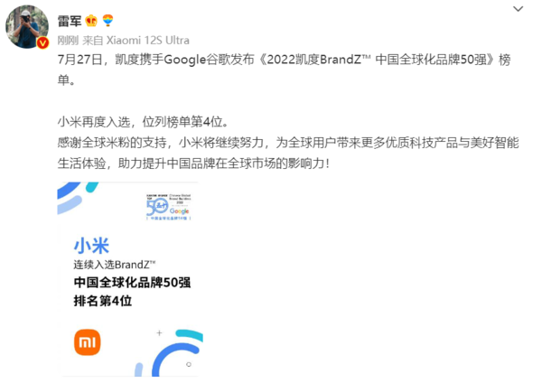 【手机中国新闻】7月28日,雷军在社交平台向大家分享小米最近获得的一项成就——在《2022凯度BrandZ中国全球化品牌50强》榜单中再度入选,位列榜单第四位。