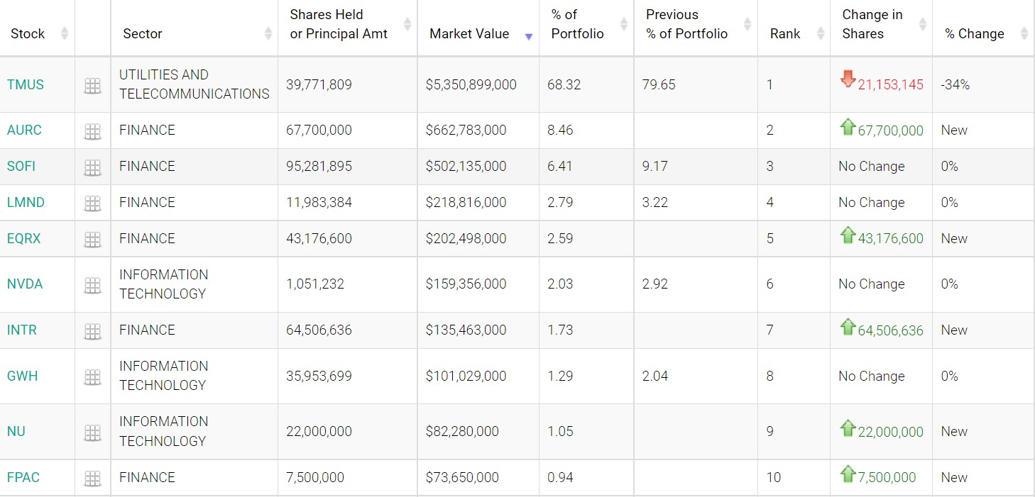 SoFi Technologies(SOFI.US)位列第三,持仓约9528万股,持仓市值约5.02亿美元,较上季度持仓数量没有变化,占投资组合比例为6.41%。