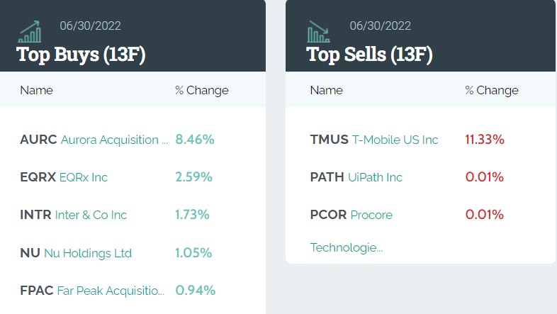 从持仓比例变化来看,前五大买入标的分别是:Aurora Acquisition Corp Class A 、EQRx 、Inter & Co Inc、Nu Holdings ,以及Far Peak Acquisition Corp。另外,软银第二季度增持的唯一个股是Satellogic Inc(SATL.US)