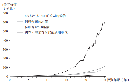用这个标准来衡量的话,那么有一群被称为“局外人”的CEO群体表现远远超过韦尔奇。我们先来回顾一下,投资“局外人CEO”的1美元其最终价值与投资同行、大盘和杰克·韦尔奇的不同。