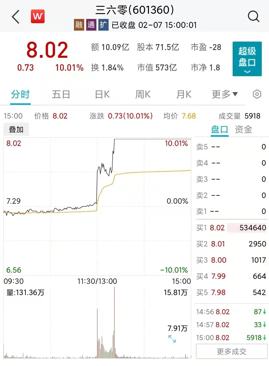 2月7日,三六零午后涨停。