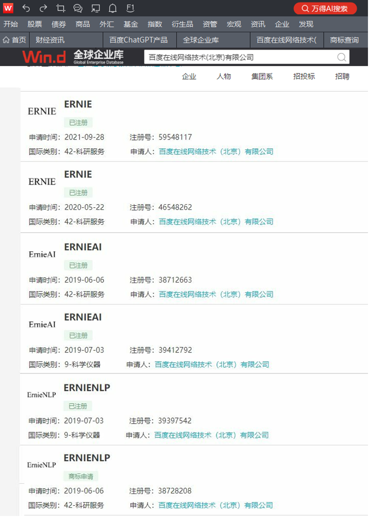 万得全球企业库数据显示,百度在线网络技术(北京)有限公司已申请注册多枚“ERNIE”“ERNIEAI”“ERNIENLP”“ ERNIE-VILG”等商标,其中多枚已注册成功,国际分类包括网站服务、科学仪器,这些商标最早申请于2019年6月,最新注册于今年1月3日。