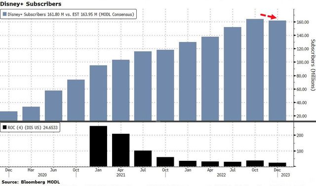 截至报告期末,Disney+订阅用户数1.618亿,逊于市场预期的1.64亿,和上一年同期相比,下降1%,这是该公司流媒体业务订阅数首次出现下降,原因是在迪士尼失去印度板球流媒体播放权后,印度的Hotstar服务被取消。