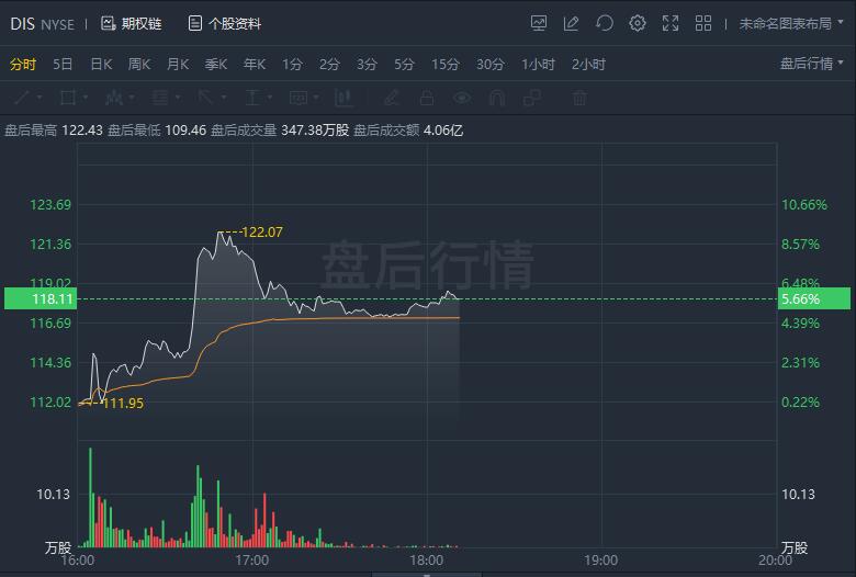 财报发布后,迪士尼美股盘后一度大涨近10%,随后涨幅回落至5%左右。