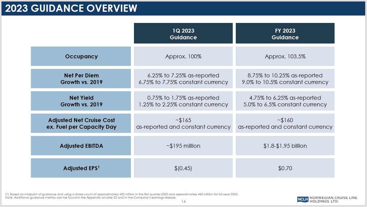 展望未来,挪威邮轮预计,2023年第一季度入住率约为100%,调整后EBITDA为1.95亿美元,调整后每股亏损为0.45美元;预计2023年入住率约为103.5%,调整后EBITDA为18亿-19.5亿美元,调整后每股收益为0.70美元。