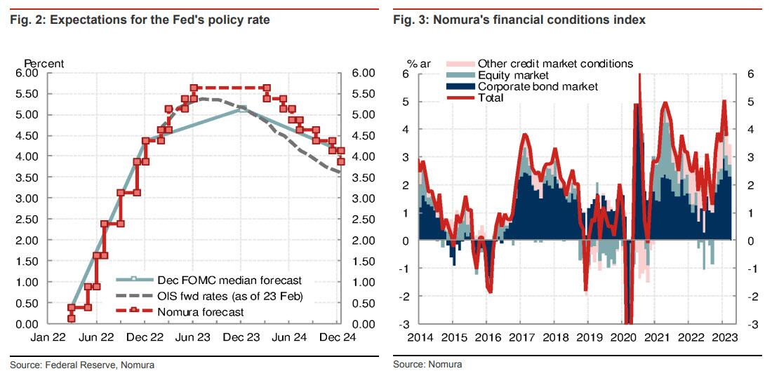 野村表示,鉴于近期金融状况持续宽松(如下方右图所示),美联储有动机达到更高的终端利率。
