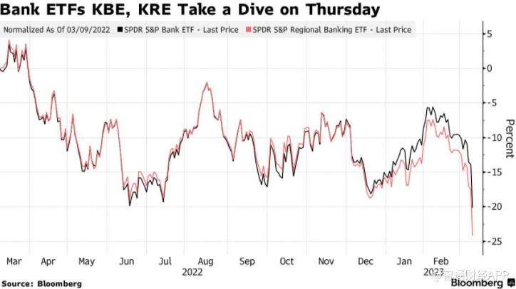 在周四的交易中,银行股的影响力显而易见。在前半个交易日,地区银行股的螺旋式下跌基本被忽视,但随着市场对银行业的紧张情绪蔓延,主要基准股指录得一个月来最大跌幅。