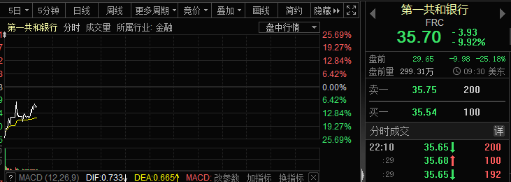 北京时间周三晚上,外围市场的确很惨。欧洲各大市场的股指跌幅一度皆超3%,瑞士信贷在瑞士市场一度大跌近30%,法国巴黎银行、法国兴业银行股价也是暴跌。美股开盘也是相当的惨淡,总部位于旧金山的第一共和银行($First Republic Bank(FRC-N)$)股价一度大跌21%。花旗集团(Citigroup)和富国银行(Wells Fargo)跌幅均一度超过4%。
