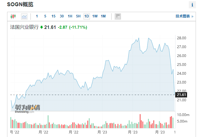 其实,还不止瑞士信贷,整个欧洲市场的银行股都不太好,特别是法国两家大银行——巴黎银行和兴业银行。前者一度大跌近10%,后者则大跌近12%。