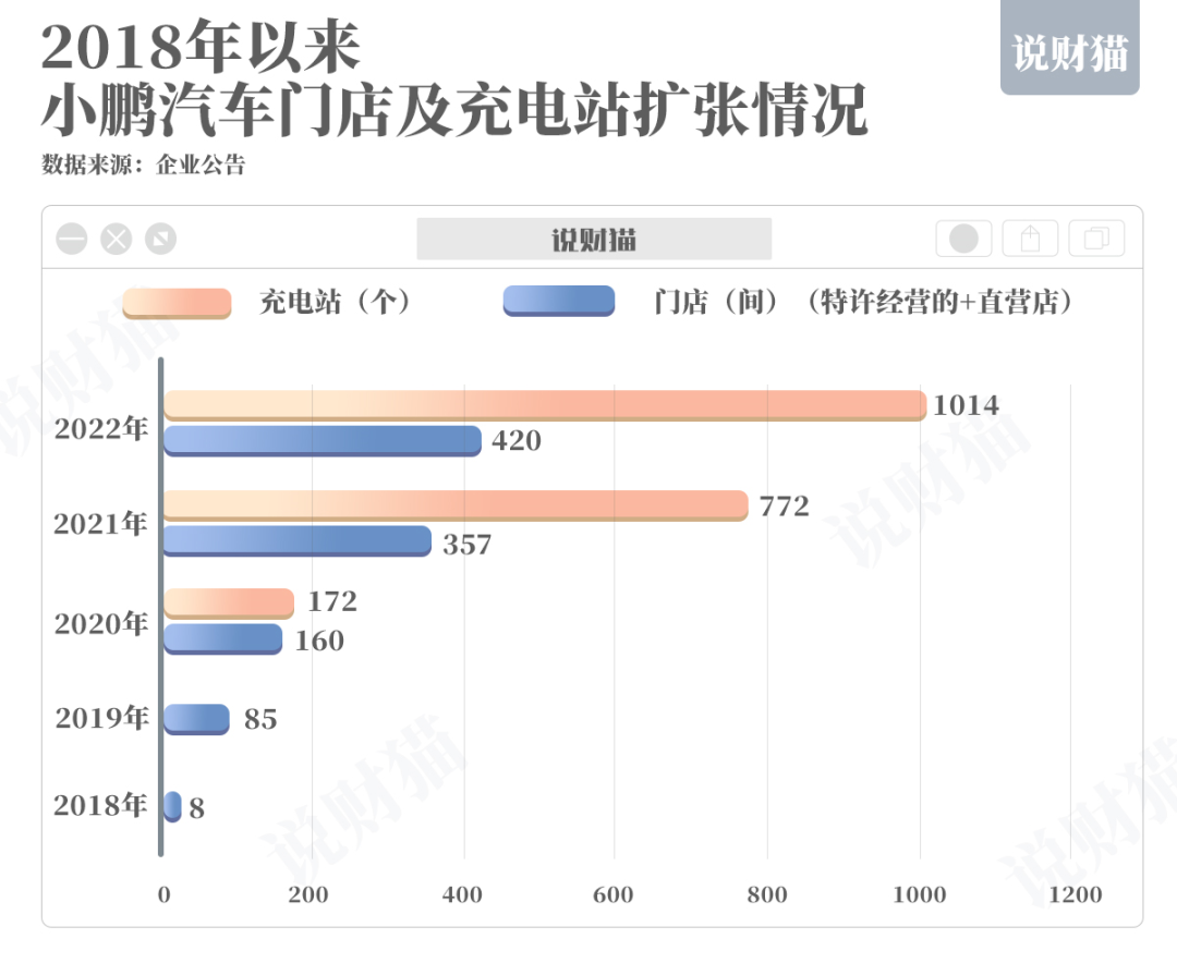 2018年,小鹏的门店数量只有8间,2019-2021年门店数量狂飙至357间,到2022年底,小鹏的门店数继续增长至420间。