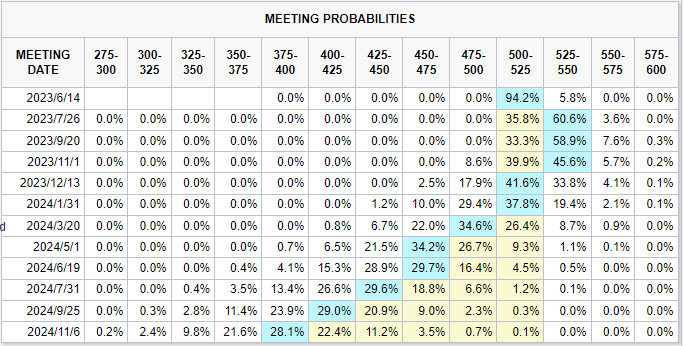 根据CME的“美联储观察”显示,美联储7月加息25个基点的可能性为60.6%,高于周二的59.9%。