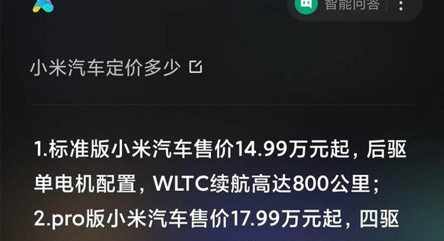 日前智电出行获取了小米首款纯电轿车车型售价,新车预计将推出标准版以及Pro版两款车型供消费者选购,市场售价分别为14.99万元、17.99万元。据悉,新车预计最快将于今年下半年上市开售,同级主要竞争对手涵盖了比亚迪秦PLUS、AION S等车型。