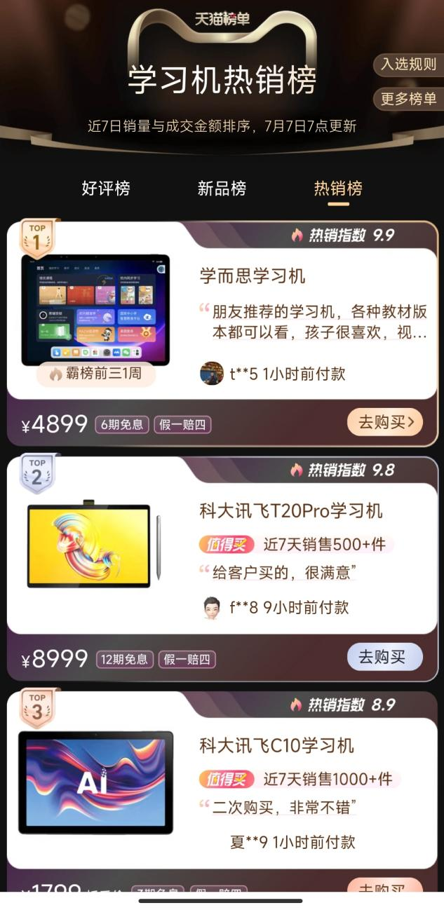 之所以在众多学习机品牌中最终选择了学而思,李女士表示:"孩子上过学而思的线下课,类纸屏的屏幕看起来也更舒服。"另一边,这款学习机在天猫上月销超过7000件,成为天猫学习机销量榜冠军,也给了李女士吃了颗定心丸。