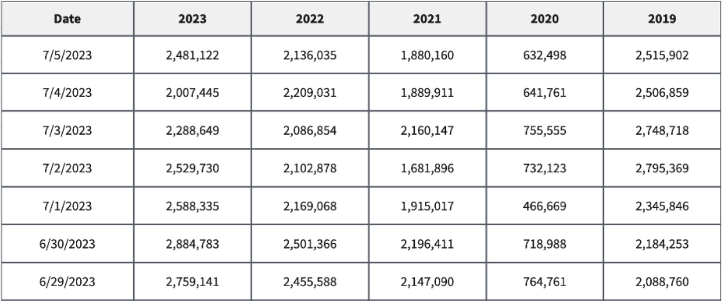 评估过去几年美国运输安全管理局(TSA)检查站安检数量将有助于投资者了解航空旅行行业的现状。据悉,在独立日周末到来之前,美国TSA曾预计,在6月29日至7月5日期间,将对1770万名乘客进行创纪录的安检。而根据TSA公布的最新数据,在截至7月5日的一周内,1753万名乘客通过了安检,这表明该机构最初的预测是准确的。此外,该机构数据还显示,今天对航空旅行的需求已完全恢复到疫情前的水平。