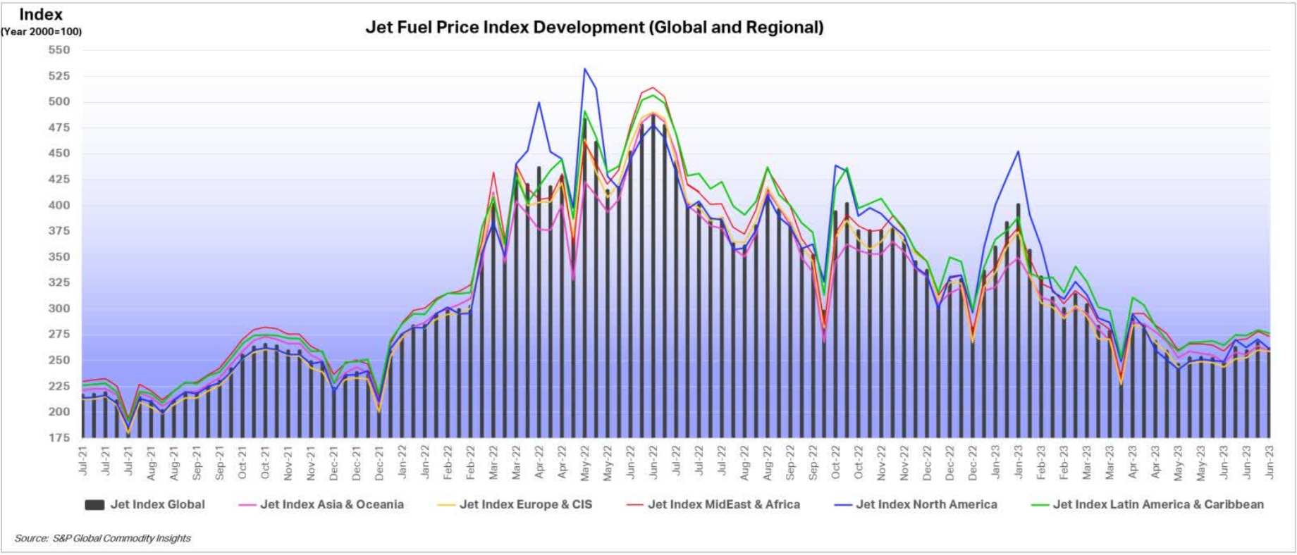 此外,今年的燃料支出可能会下降,这是一个令人鼓舞的迹象。根据国际航空运输协会的最新数据,截至6月30日当周,北美地区的航空燃油成本平均为每桶98.32美元,较上年同期显著下降了32%。如下图所示,自今年年初以来,全球航空燃油价格一直在稳步下降。